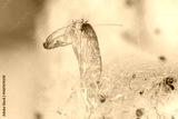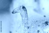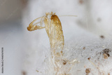 Pupal exuviae sticking out of the fabric abandoned by adult moths of clothing moth, Tineola bisselliella, known as the common clothes moth or webbing clothes moth.