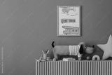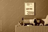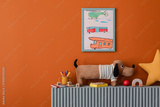 Playful shelf with plush dog toy, framed child drawing, colorful books, and school supplies. Orange wall and soft colors create a cheerful atmosphere.