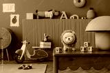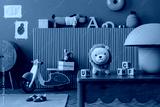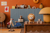 Stylish children room with orange wall, soft toys, scooter, alphabet blocks, and wooden furniture. A cozy and imaginative play space.