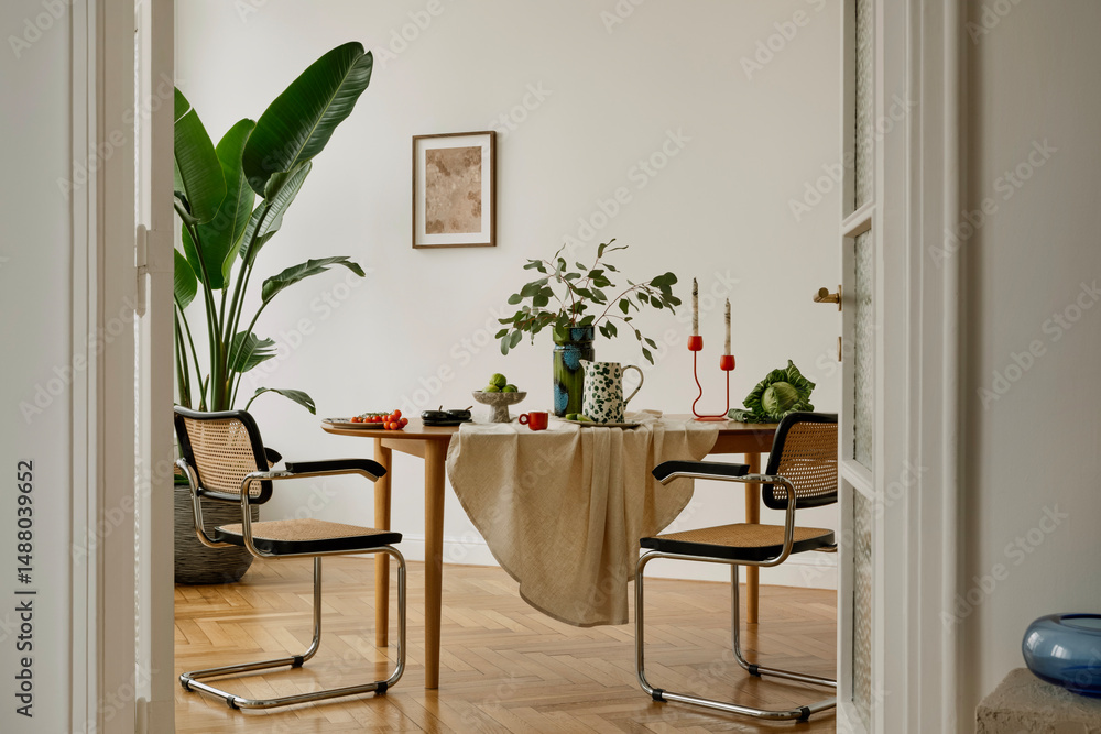 Dining table with lush greenery, playful red candleholders, and a mix of textures. A cozy and creative interior blending plants, textiles, and colorful ceramics.