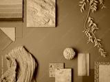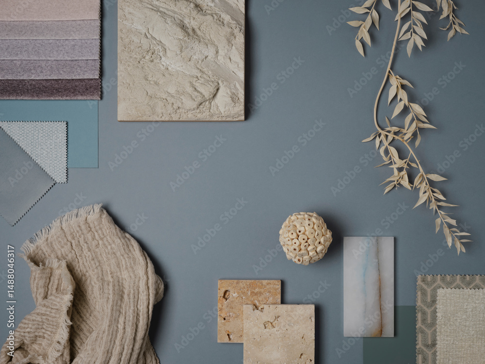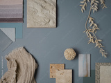 Soft-toned material board with natural stone, fabrics, and dried foliage for a serene interior mood.