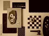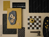 Earthy-toned material board with checkerboard tiles, wood accents, and dried fruit on textured stone