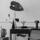 Modern composition of workplace interior with black desk, rattan chair, colorful sculpture, vase with leaves, rack, books, wall with stucco and personal accessories. Home decor. Template.