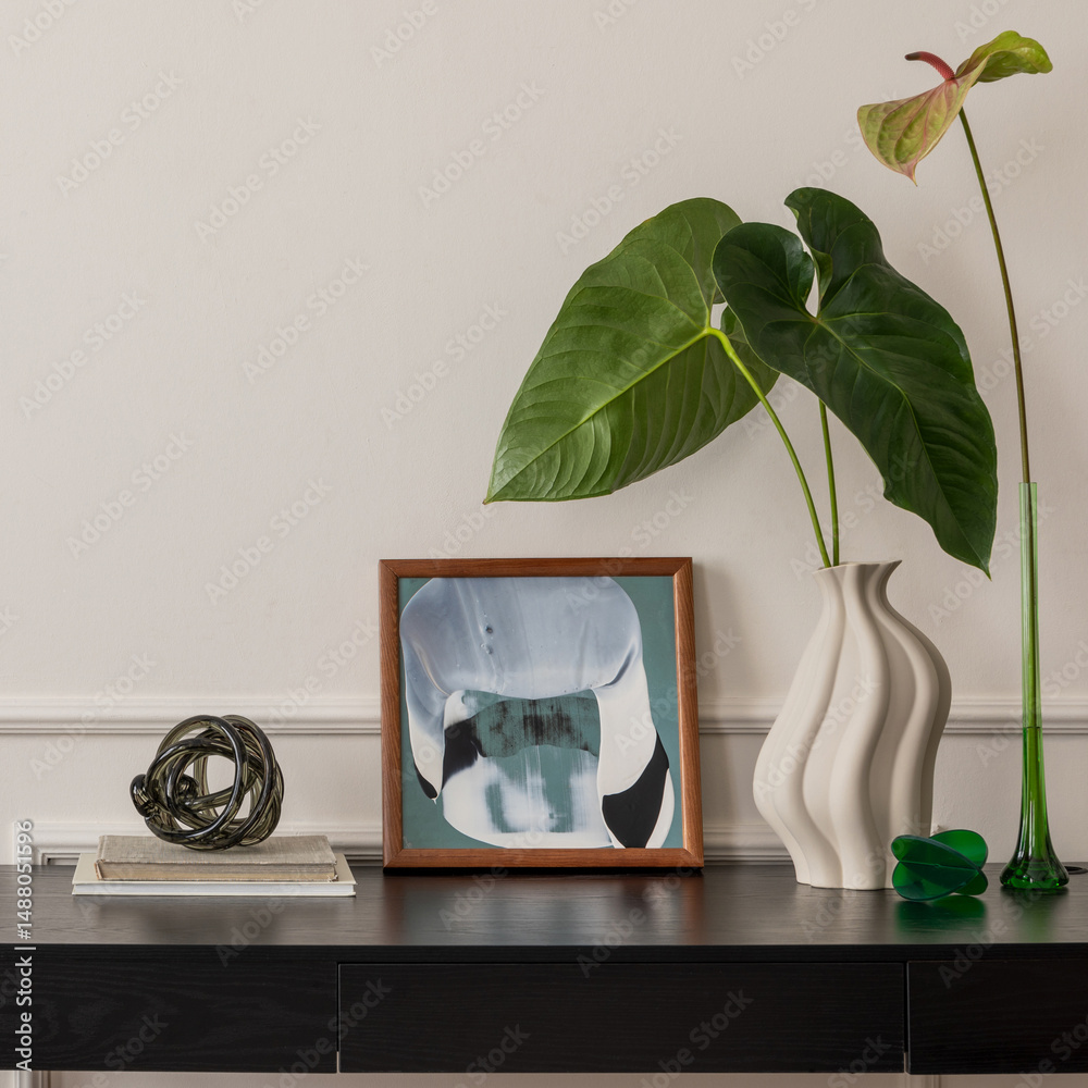 Minimalist compositions on the wooden black desk with modern poster mock up frame. Home desk.