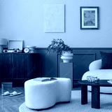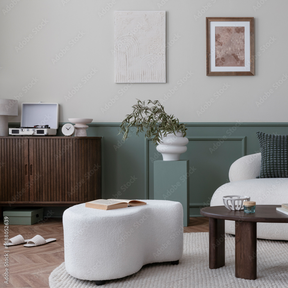 Creative composition of living room interior with mock up poster frame, boucle sofa, stylish lamp, round rug, wooden coffee table, sideboard, slippers and personal accessories. Home decor. Template.