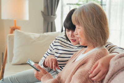 happiness asian family old mother and female adult relax at home using smartphone order food deleverd online joyful love motion mother day lifestyle bonding relation mom and daughter at home