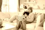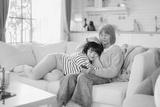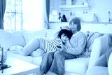 family concept lovely mother and daughter lying down embrace bonding relation stay home spending good moment conversation smartphone at home