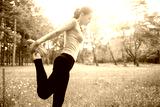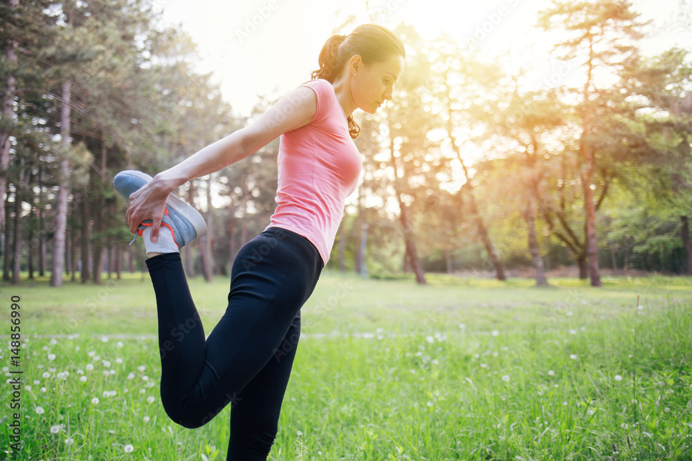 Fitness woman streching leg in sunset park