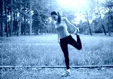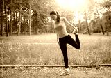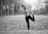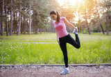 Young fitness woman streching leg in the summer park