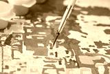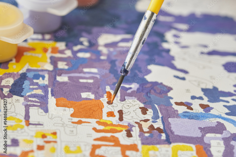 Close up of paintbrush on colorful paint by numbers canvas with bright colors and detailed patterns.