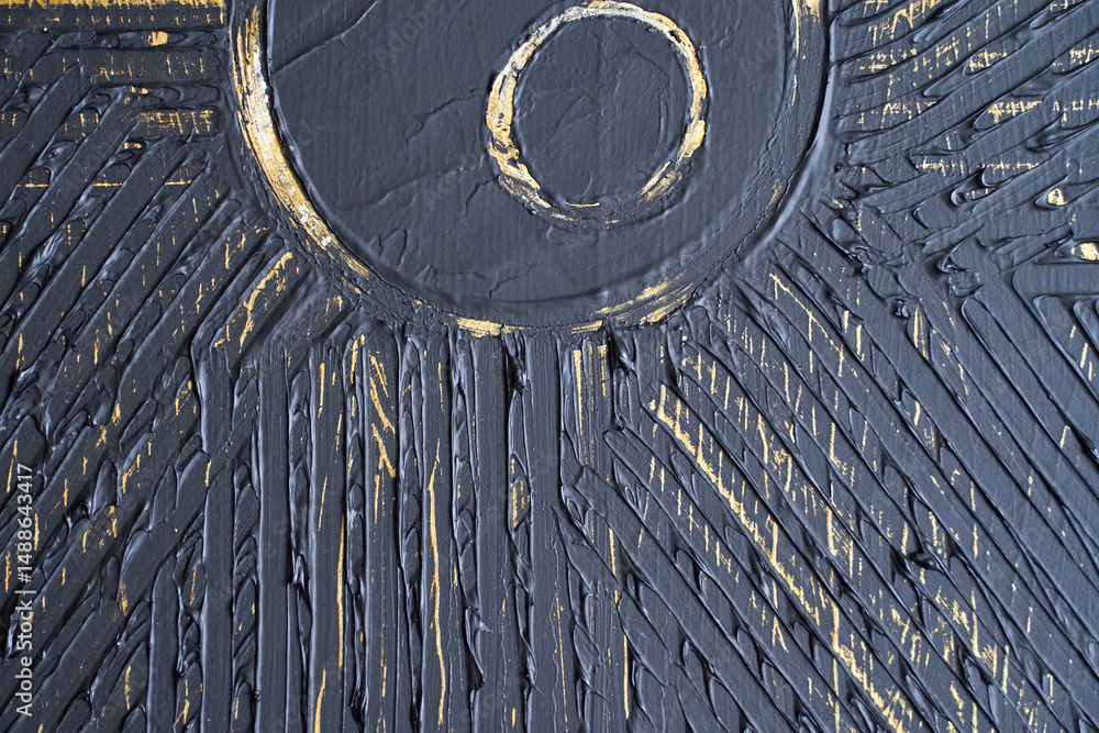 Abstract textured painting with circular motif and radiating lines in grey and gold.