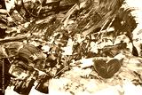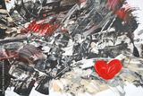 Abstract expressionist artwork with red heart on bold textured black and white background.