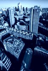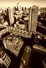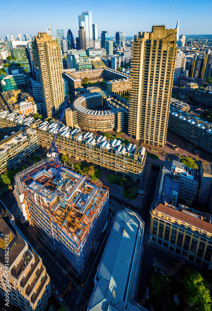 Colorful aerial view of London's Barbican Estate with high-rise buildings, modern architecture, and city skyline under a blue sky