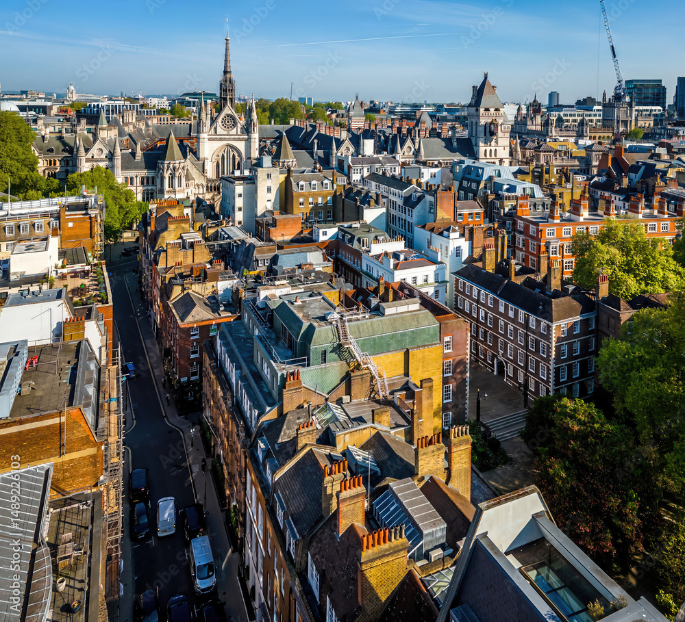 Aerial view of the historic Royal Courts of Justice in London's legal district on a clear day