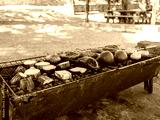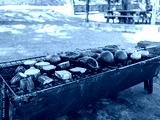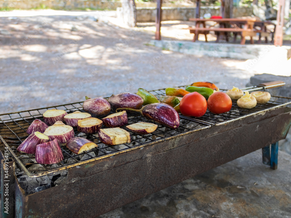 Barbecue grill with vegetables cooking on gridiron at picnic site