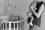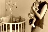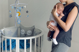 mother sleeping on the chest of his son is at round bassinet at home