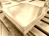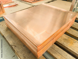 Stack of shiny copper sheets lying on wooden pallet in metalworking plant