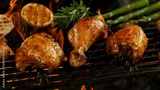 Close-up of Delicious Chicken Legs on a Grill with Roaring Flames