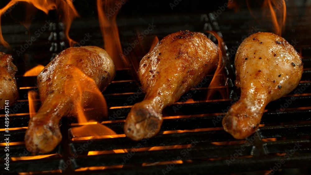 Close-up of Delicious Chicken Legs on a Grill with Roaring Flames