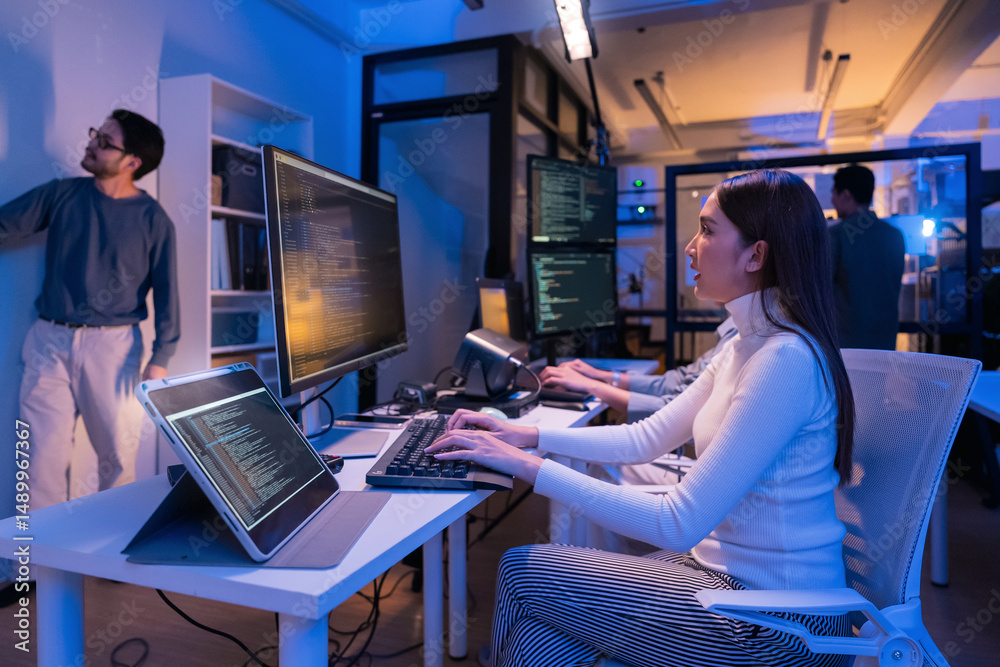 young Asian software development manager leads a late-night office discussion with his executive team, mentoring developers and analyzing source code to guide programming and project development