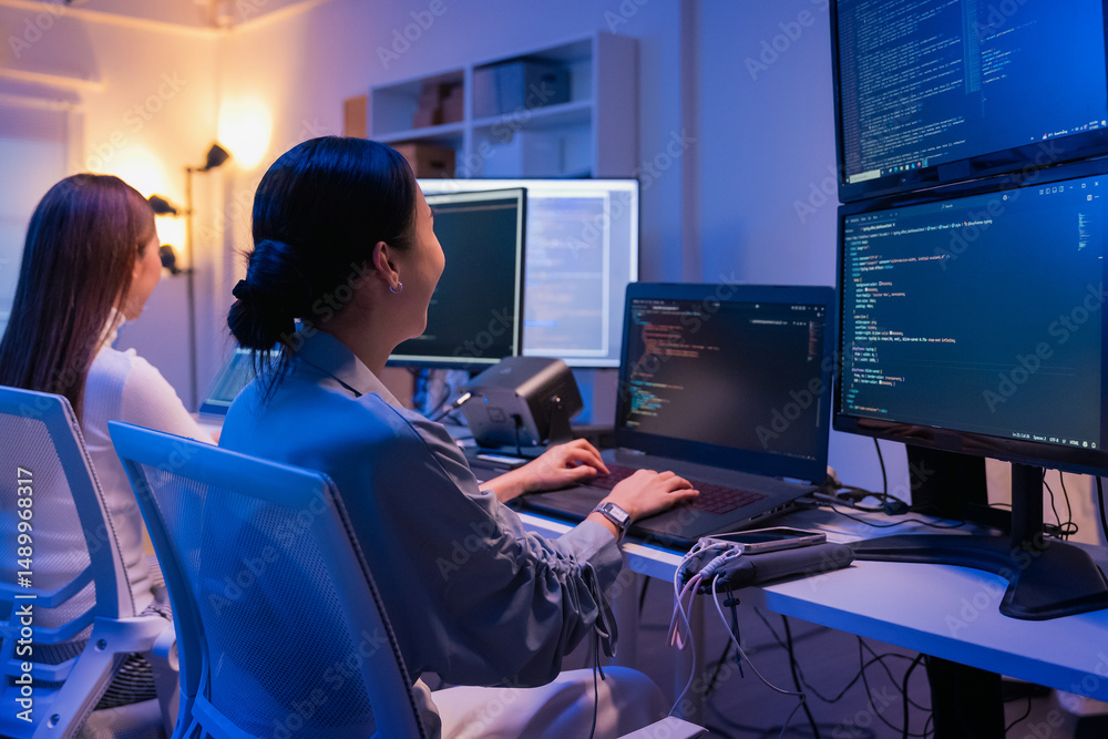 Professional computer engineer working on a new software technology design in the office Night, focus or programmer review search engine process, software or IT database development