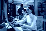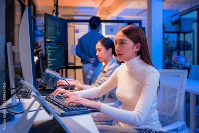 Professional computer engineer working on a new software technology design in the office Night, focus or programmer review search engine process, software or IT database development