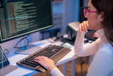 asian female programmer sits a dark tech workspace at night, fully focused on developing an online project. She writes HTML scripts and code for a modern website while contributing to automation work