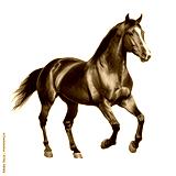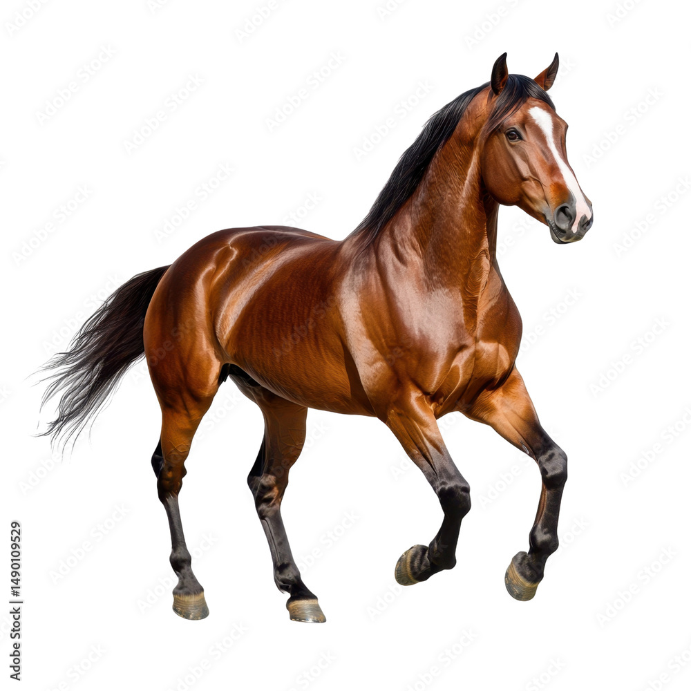 Majestic brown horse running gracefully in an open field, showcasing its strength, beauty, and agility against a natural backdrop of green grass.