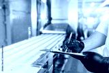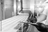 Confectionery production line inspection by female caucasian technologist ensuring quality control, sunlight