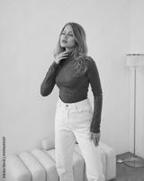 Woman in a bright pink turtleneck and white pants stands confidently, touching her neck. The room is minimalistic with a modern lamp and a cushioned seat nearby