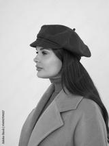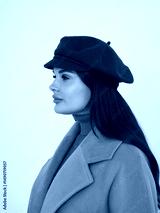 Profile of a woman wearing a bright red beret and mustard coat, complemented by a red turtleneck sweater. She has long dark brown hair and is gazing confidently ahead