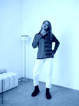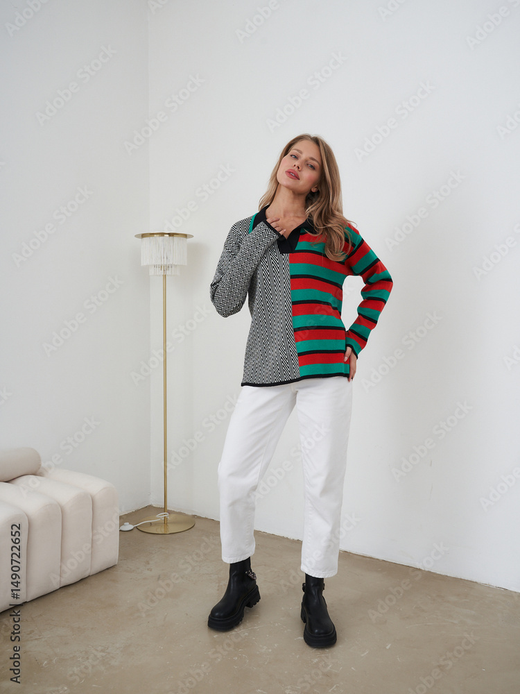 Young woman stands confidently, wearing a half-grey, half-striped knit sweater and white pants. She poses with one hand on her hip, next to a modern lamp and a beige couch