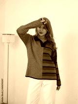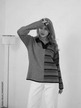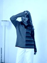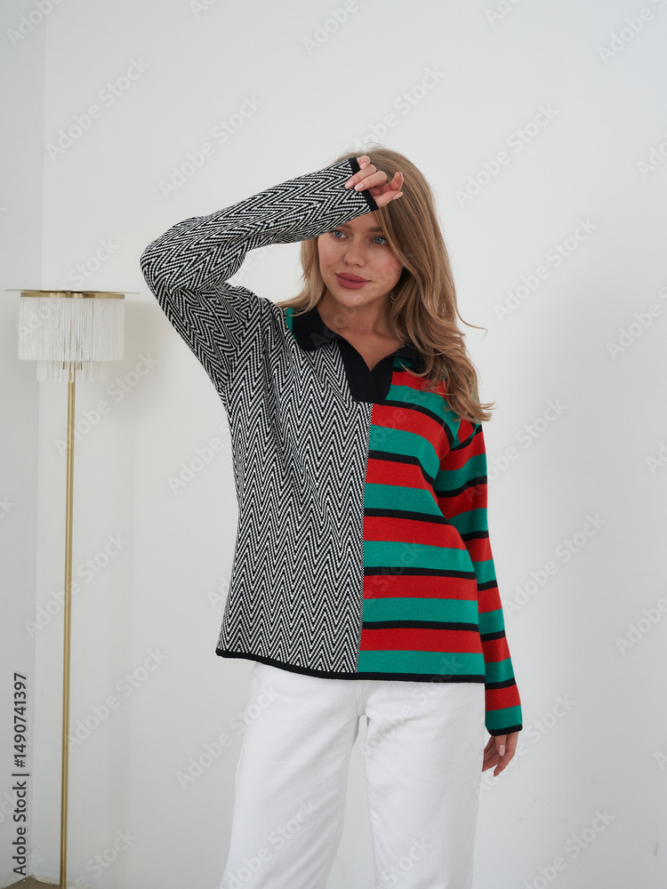 Blonde woman in stylish mix-pattern sweater posing in modern studio setting