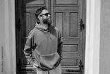 Bearded hipster in dark grey hoodie and sunglasses – urban apparel mockup