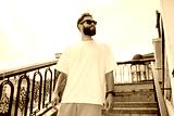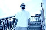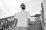 White T-shirt on a bearded hipster in sunglasses — urban mockup for brands