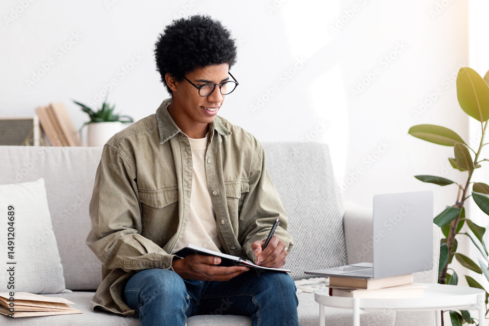 Distance education concept. Focused black student studying remotely on laptop computer at home. Busy teenage guy taking notes during web conference, online lesson or webinar indoors