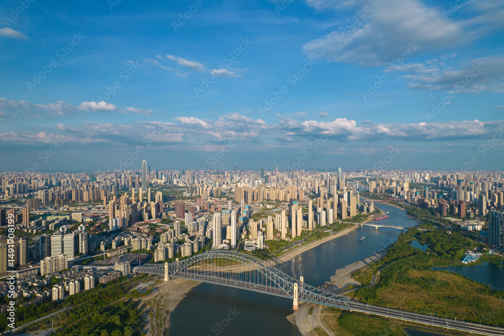 Aerial view of Wuhan skyline and Yangtze river with supertall skyscraper under construction in Wuhan Hubei China.