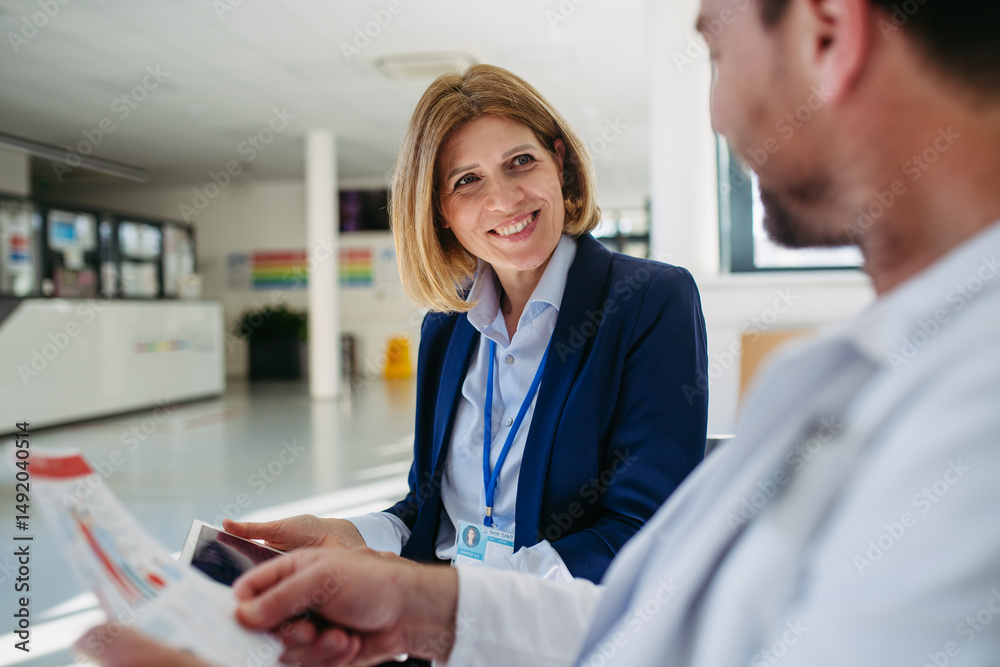 Pharmaceutical rep and doctor discussing drug samples and prescriptions