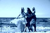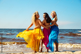 Three joyful Women in colorful flowing Dresses dancing and hugging on the Beach. Happy Female Friends enjoying Summer Vacation together by the Sea, celebrating friendship, freedom, and life