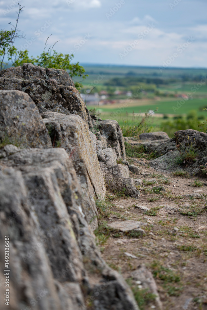 anicient stone formation and path on a hill with green forest in the background