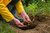 Planting dahlia plants in a flowerbed. Woman planting presprouted dahlia tubers in her garden.