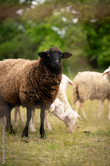 black, brown and white sheep and lamb in the herd grazing in the countryside on a green pasture