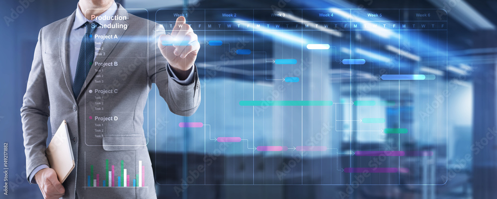 Project management. Chart for plan tasks and progress. Planning software. Corporate strategy finance, operations, sales, marketing