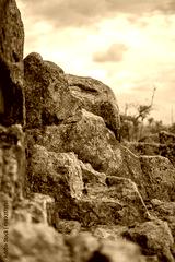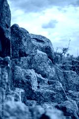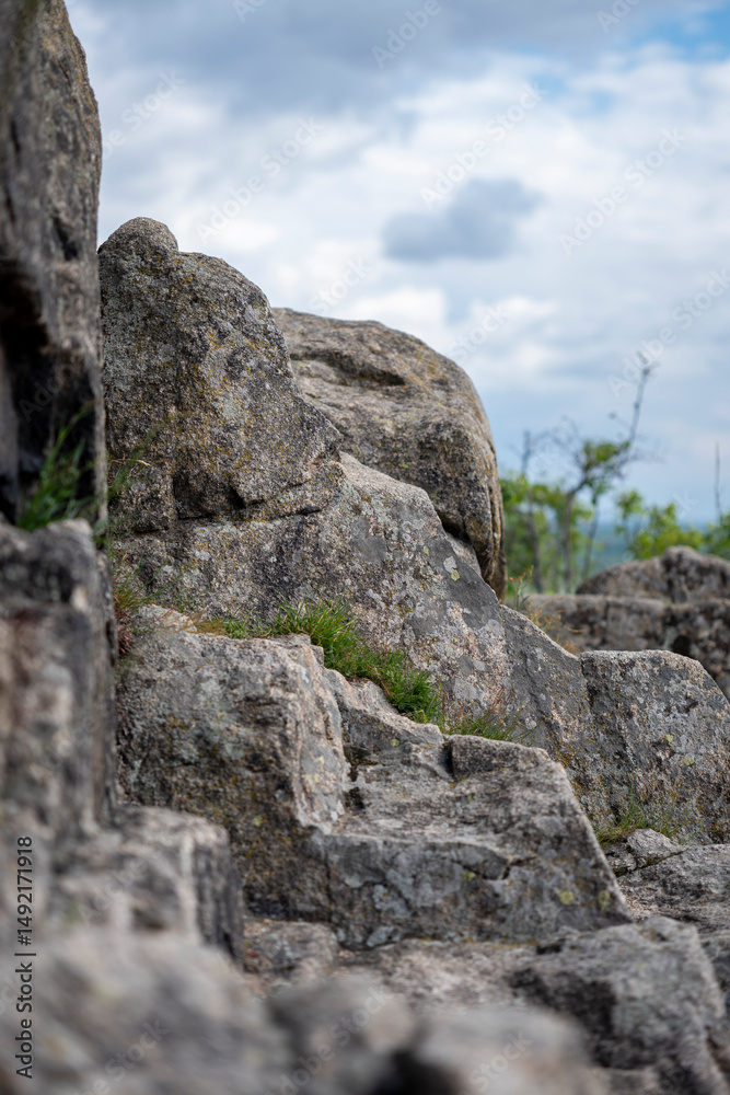 rockformation stone wall in the mountains with cloudy blue sky in the background