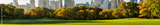 Panoramic view of Central Park South from Sheep Meadow in early morning sunlight. Midtown skyscrapers. Manhattan, New York City