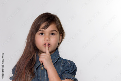 Portrait of brunette long haired little girl gesturing shush. Girl is facing the camera on a gray background.