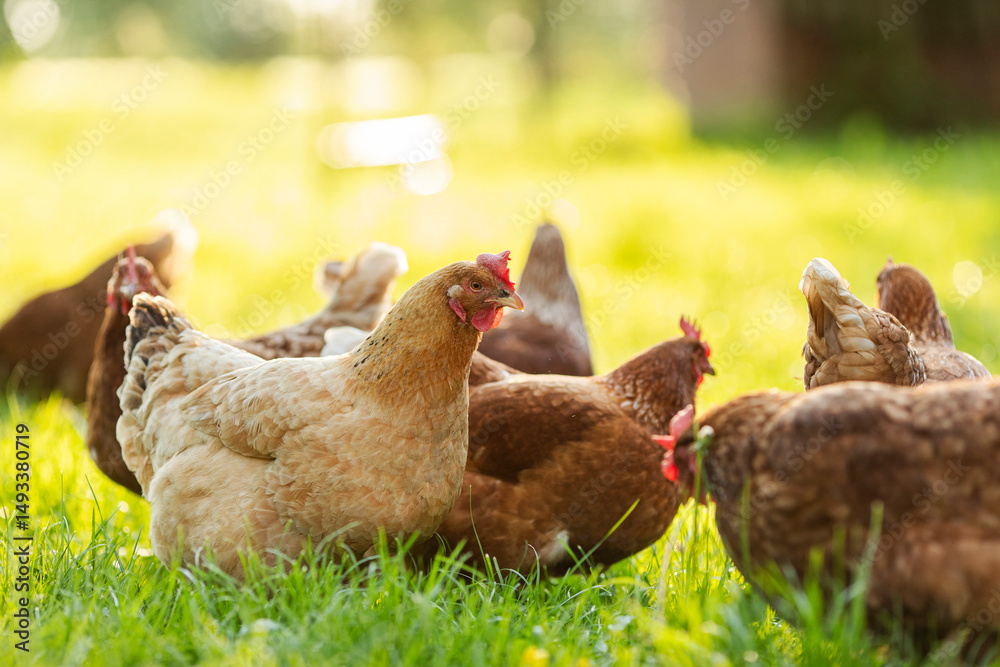 Roosters and hens feeding in farm garden grass, walking outdoors in the morning sunlight