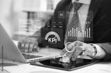 Business professional using KPI dashboard with AI-powered performance analytics, sales growth data, and risk indicators to drive financial strategy and operational optimization in corporate setting