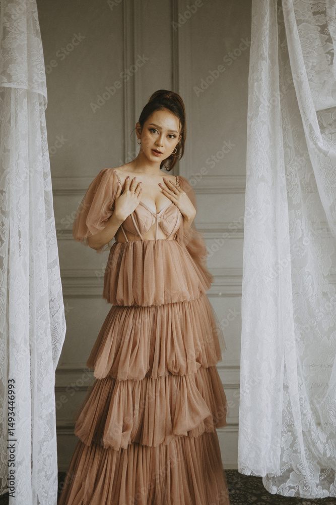 Elegant woman wearing a tiered gown with sheer sleeves poses indoors with curtains