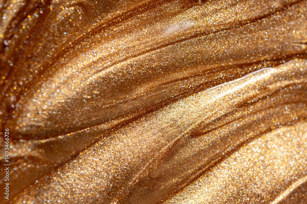 Close up view of golden shimmering cosmetic texture of gel or body spray. Background texture for backdrops or mapping.